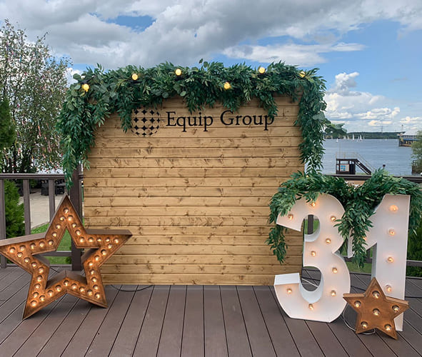 Стильная деревянная фотозона размером 2х2 метра, украшенная гирляндой из искусственной зелени и декоративными лампочками. Дополнена световыми звездами, световыми цифрами и индивидуальной надписью. Создает уютную и праздничную атмосферу для фотосессии.