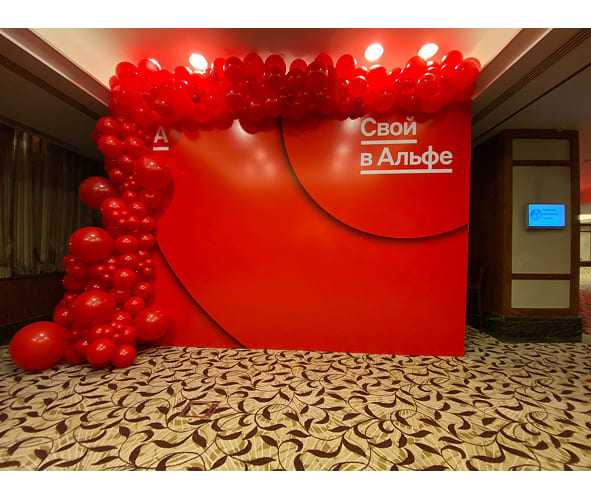Простое и эффективное преображение стандартного баннера. Гирлянда из шаров мгновенно делает его праздничным и нарядным. Быстрый способ создать новогоднее настроение в бизнес-пространстве без больших затрат.