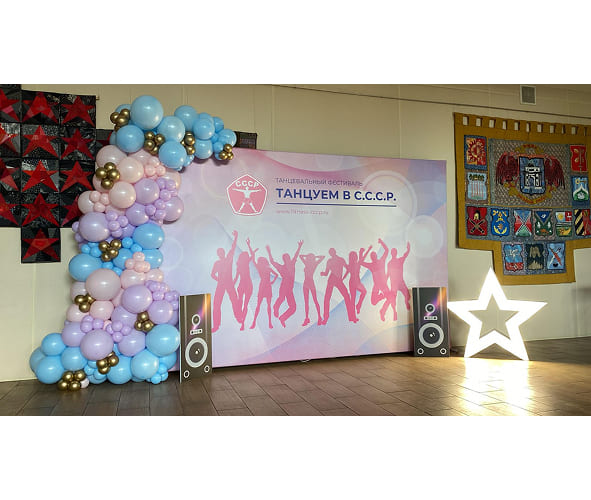 Эффектное сочетание строгого брендирования и праздничного декора. Разнокалиберные шары и колонны делают стандартный баннер нарядным и привлекательным. Отлично подходит для корпоративных мероприятий, где важно сохранить деловой стиль, но добавить праздничную нотку.