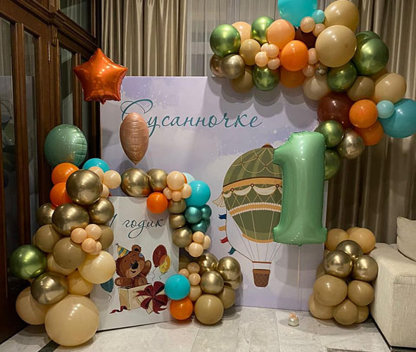 Яркая фотозона для первого дня рождения с воздушными шарами в нежных и ярких оттенках создает праздничную атмосферу. Центральный элемент — красочная иллюстрация с воздушным шаром с индивидуальной надписью, украшенная большими шарами и тематической гирляндой. Идеально подойдет для памятных снимков и оставит яркие впечатления у всех гостей!