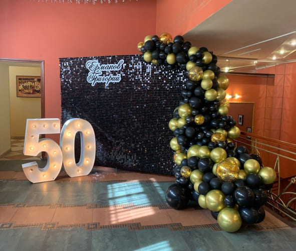 Стильная фотозона размером 2,4х3 метра, выполненная из сверкающих черных паеток. Украшена объемной гирляндой из воздушных шаров разных размеров. Дополнена современными световыми цифрами и индивидуальной табличкой. Идеально для вечернего мероприятия.