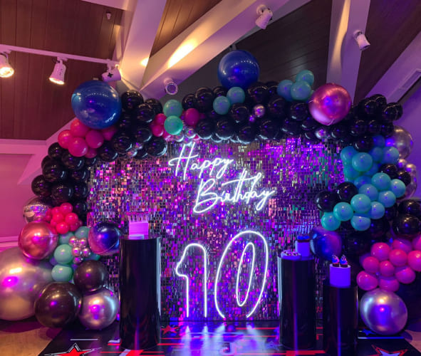 Роскошная фотозона 2,4х3 метра из серебристых паеток с гирляндой из разноразмерных шаров. Комплектуется модными неоновыми надписями, напольным покрытием и тремя стилизованными кенди-барами. Создает эффектное пространство для фото на масштабном мероприятии.