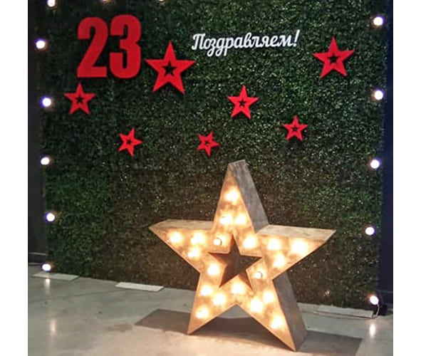 Фотозона из искусственной зелени с красивой световой гирляндой, поздравительной надписью и декоративными звездами. Создает природную и в то же время праздничную атмосферу.