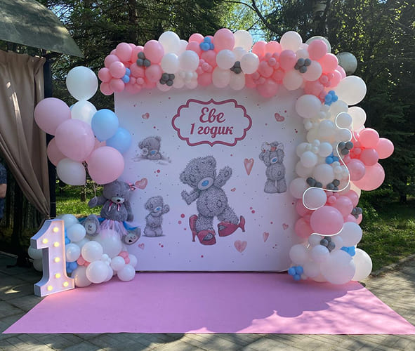Масштабная фотозона с баннером 2,4х3 метра, украшенная гирляндой из шаров. Включает световую цифру, плюшевого медведя, фонтан из гелевых шаров и напольное покрытие. Идеально для детского дня рождения.