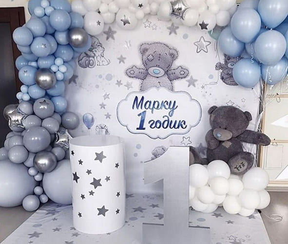 Элегантная круглая фотозона, украшенная разнообразной гирляндой из воздушных шаров разных размеров. В композицию входят напольное покрытие, декоративный тубус, праздничная цифра, плюшевый медведь и впечатляющий фонтан из гелевых шаров. Идеальное место для запоминающихся фотографий на любом торжестве.