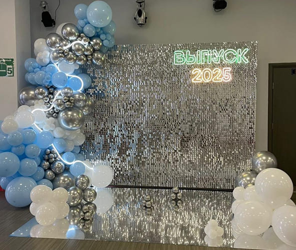 Современная фотозона 2,4х3 метра в стиле неон с гирляндой из шаров, неоновой подсветкой и индивидуальной неоновой табличкой. Зеркальный пол добавляет объем и создает эффект бесконечности. Модное и стильное решение для современного выпускного.
