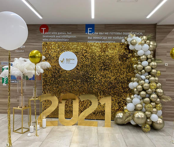 Роскошная фотозона 2,4х3 метра с гирляндой из шаров, искусственной зеленью и индивидуальной табличкой. В композицию входят элегантные стойки с вазонами перьев, вазы с насыпными свечами, праздничные цифры и гелевые шары. Изысканное решение для выпускного бала.