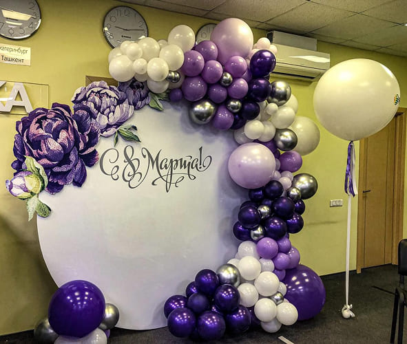 Великолепная круглая фотозона с цветочными элементами декора, гирляндой из разнокалиберных шаров и впечатляющим шаром-гигантом. Яркий акцент для любого торжества.