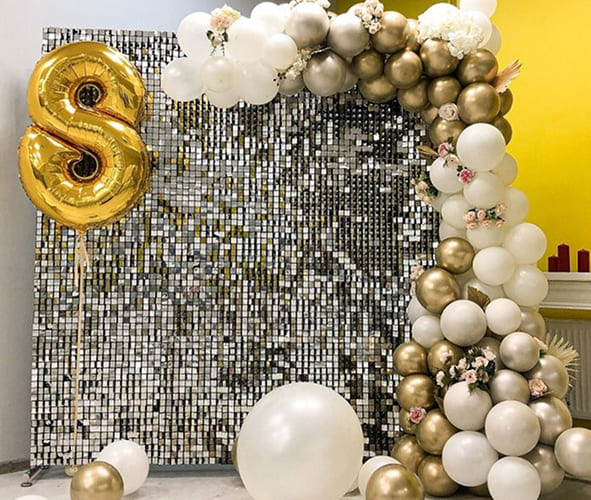 Элегантная фотозона из серебристых пайеток 2,4х3 метра с гирляндой из разноразмерных шаров и воздушной цифрой. Создает праздничное настроение.