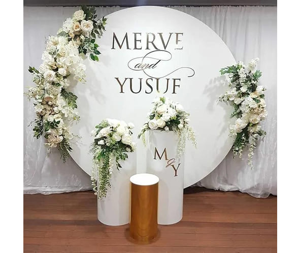 Элегантное свадебное фотозонирование с крупным белым кругом, украшенным изысканной флористикой из белых роз и зелени. В центре — изящный держатель с именами молодожёнов в стильной каллиграфии, дополненной мини-табличкой с инициалами. Идеально подходит для запечатления памятных моментов свадьбы.