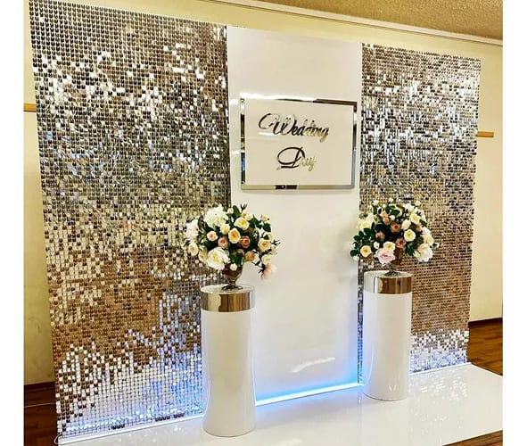 Элегантная свадебная фотозона с эффектной зеркальной мозаикой и подсветкой создает роскошную атмосферу торжества. Две стильные белые вазовые композиции с изысканными букетами свежих цветов добавляют изюминку и гармонию. Центральный экран с надписью «Wedding Day» подчеркнет важность вашего праздника.